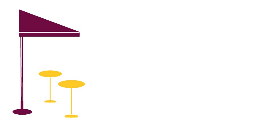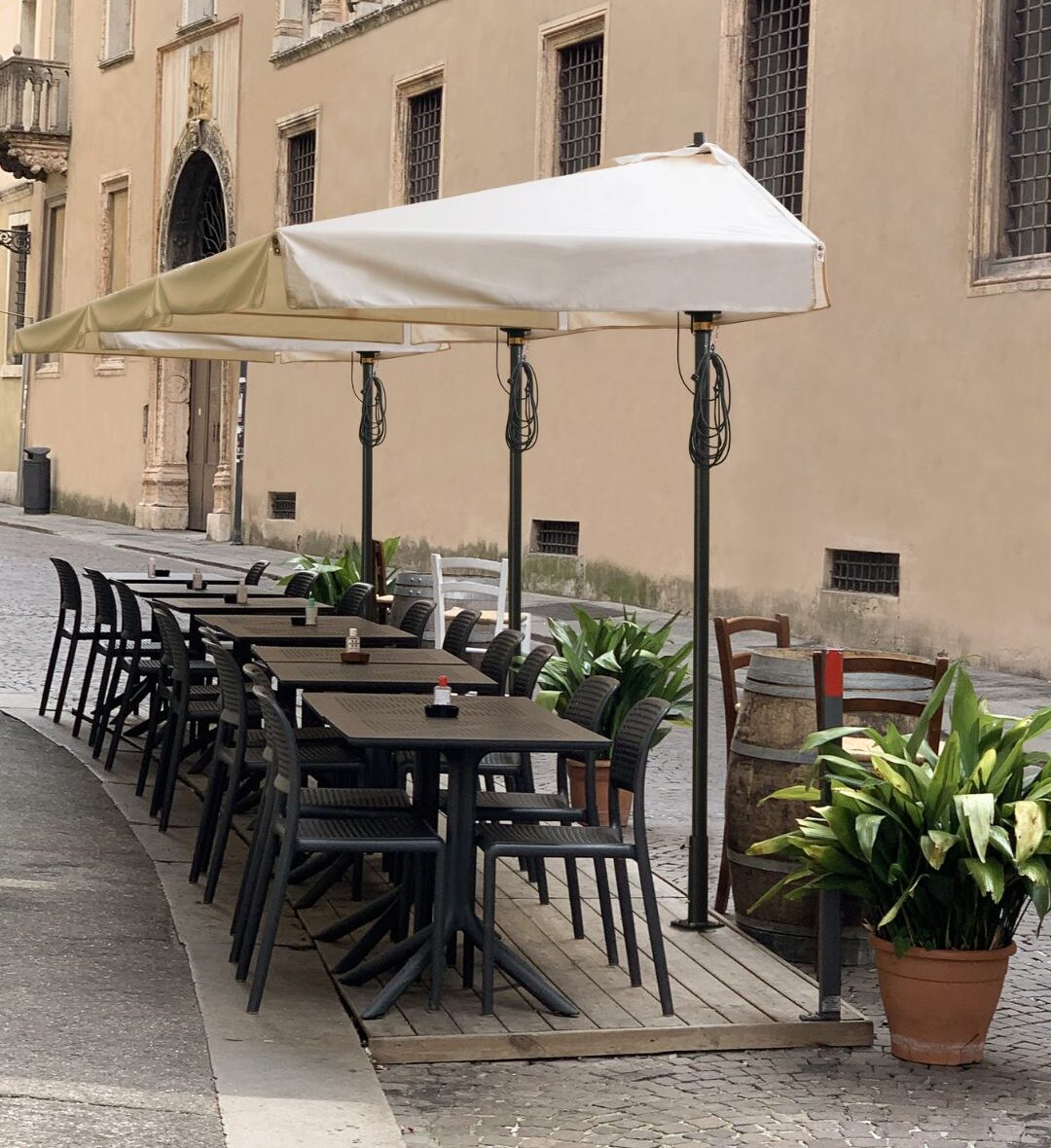 In piazza, lungo i portici e le vie: l’ombrellone mezz’ombra da bar è l’ideale perché aderisce perfettamente alle pareti.