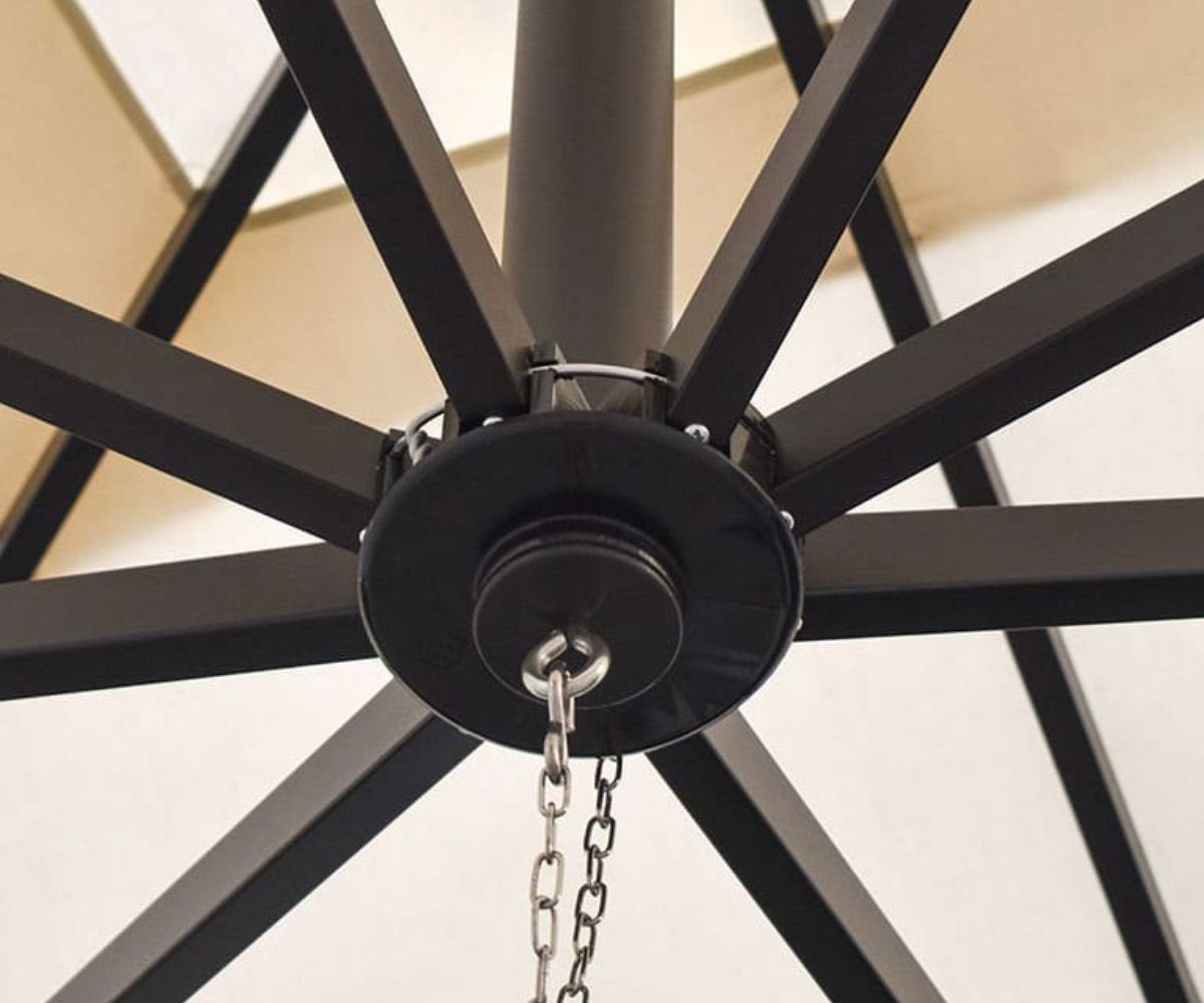Il telo parasole prevede sulla sommità un camino antivento. Questo semplice componente aiuta all’ombrellone di resistere alle raffiche di vento senza inarcarsi o addirittura cadere a danno di persone o cose.