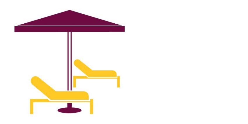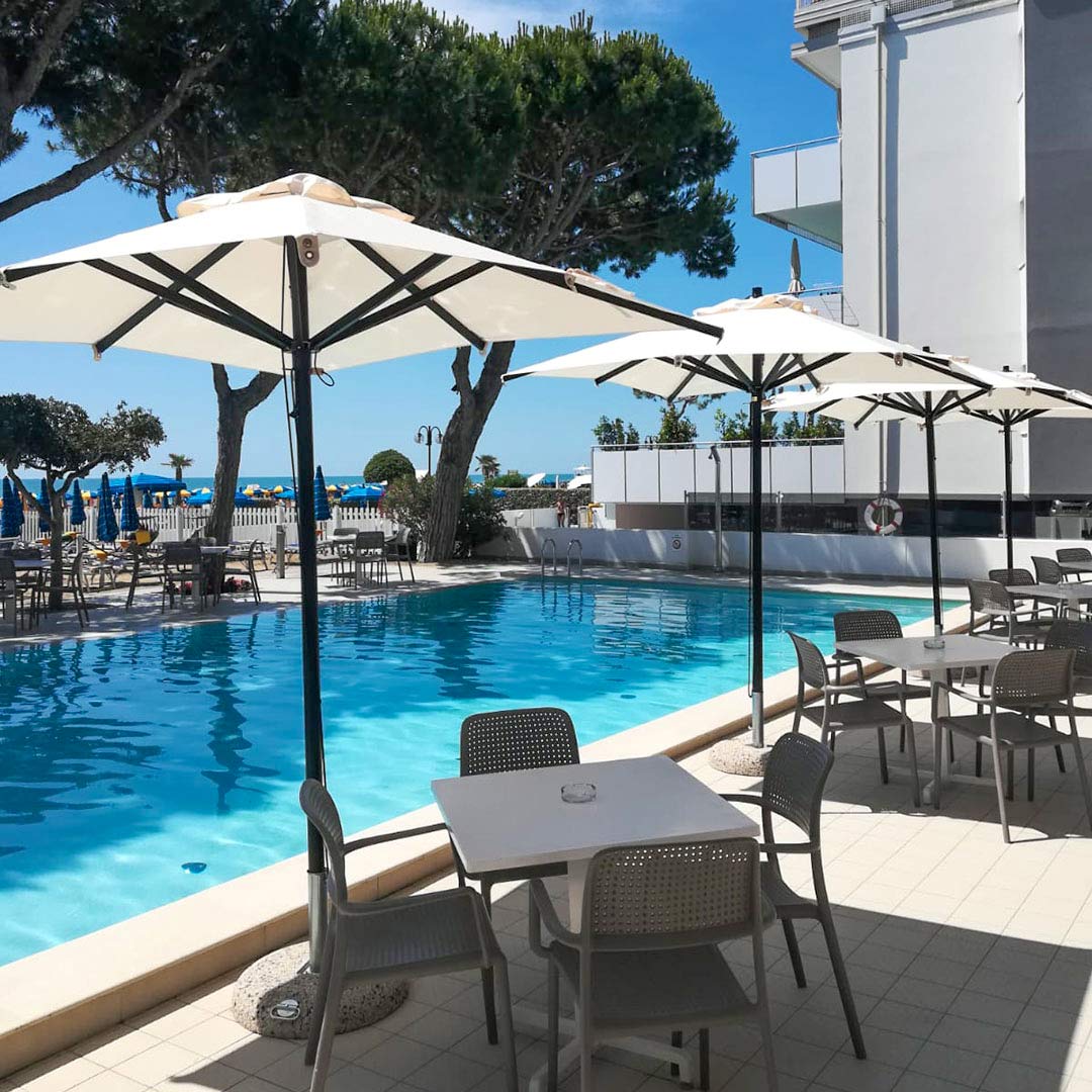 Ad ognuno la propria oasi di pace: l’ombrellone a palo centrale crea lo spazio ideale per organizzare lettini e zone d’ombra a bordo piscina.