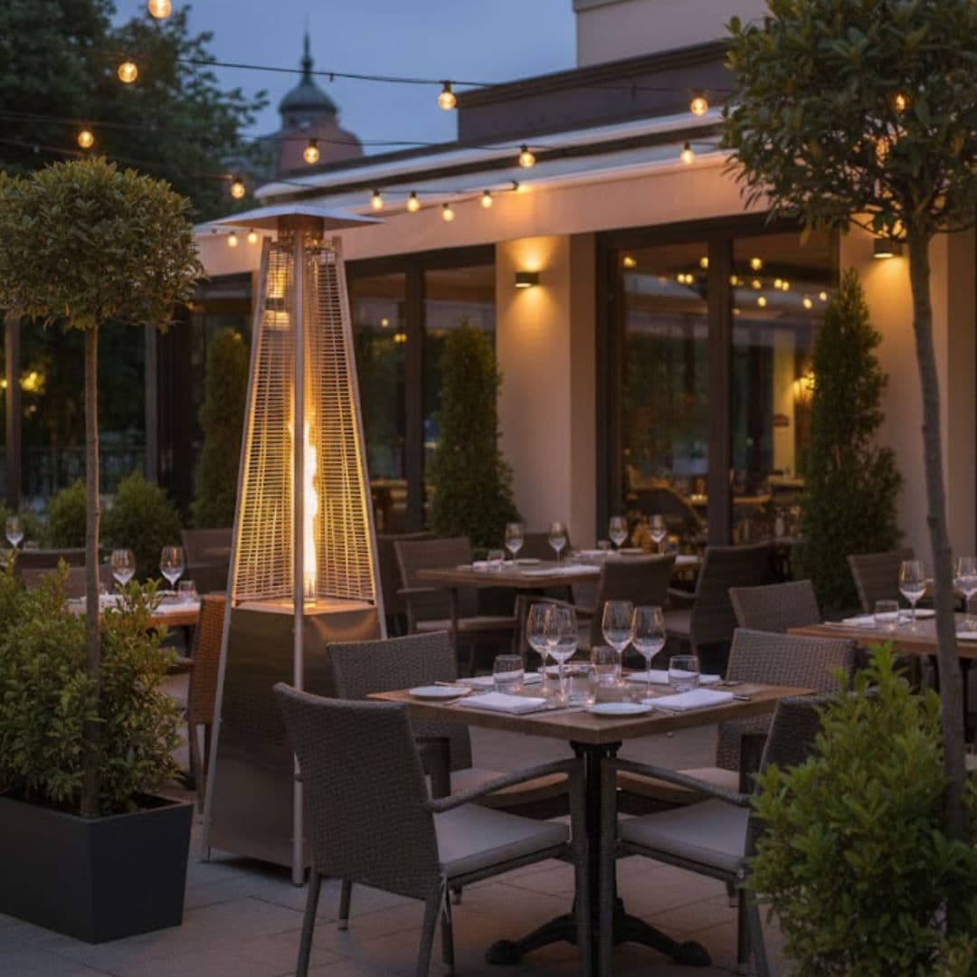 Stufa da esterno a gas. Ideale per riscaldare grandi aree esterne di attività ricettive come bar, ristoranti e hotel. Scegli un riscaldamento sicuro ed economico anche durante i mesi più freddi.